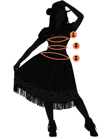 S: (1) Pit 80-90 cm, (2) Cintura 67-670 cm, (3) Caderes 94-97 cm